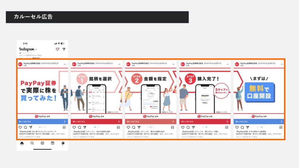Instagram広告は、1枚画像や動画以外にも、複数枚の画像をスライドで表示させ「カルーセル広告」や複数商品をまとめて表示できる「コレクション広告」など、さまざまな広告フォーマットが用意されています。