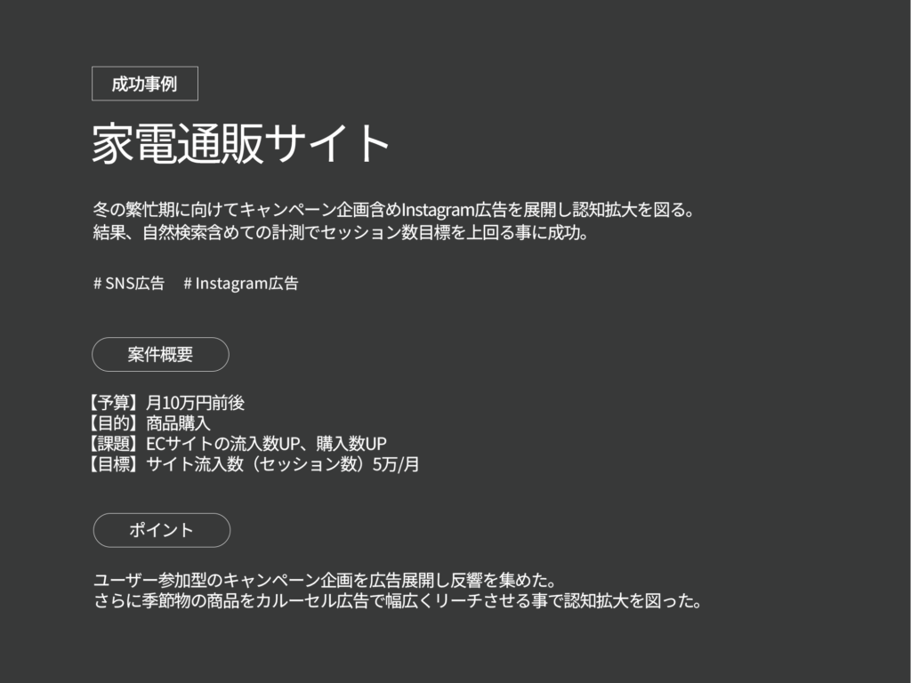 家電通販サイトの認知拡大を図った成功事例です。Instagram広告のリマーケティング・類似オーディエンスを活用することで、月額10万円程度の少ない予算の中で効率良く広告を配信できました。