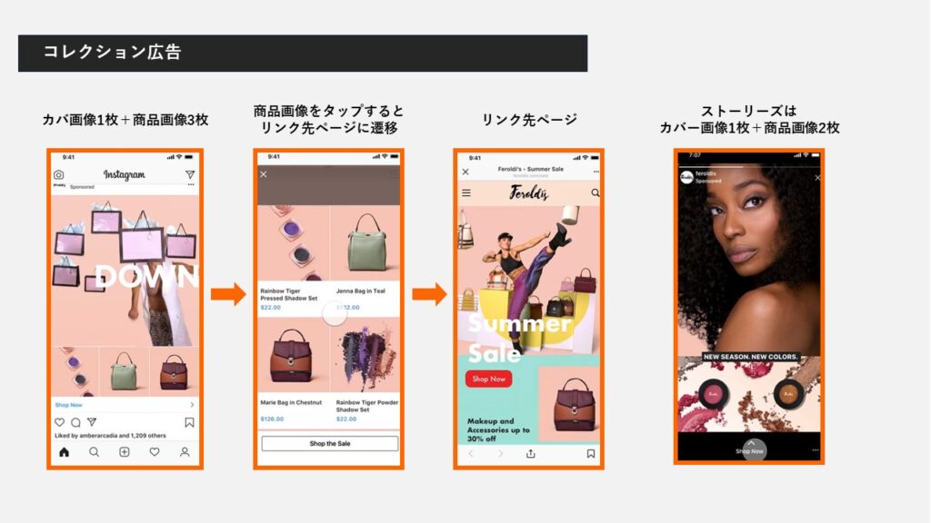 Instagram広告は、1枚画像や動画以外にも、複数枚の画像をスライドで表示させ「カルーセル広告」や複数商品をまとめて表示できる「コレクション広告」など、さまざまな広告フォーマットが用意されています。
