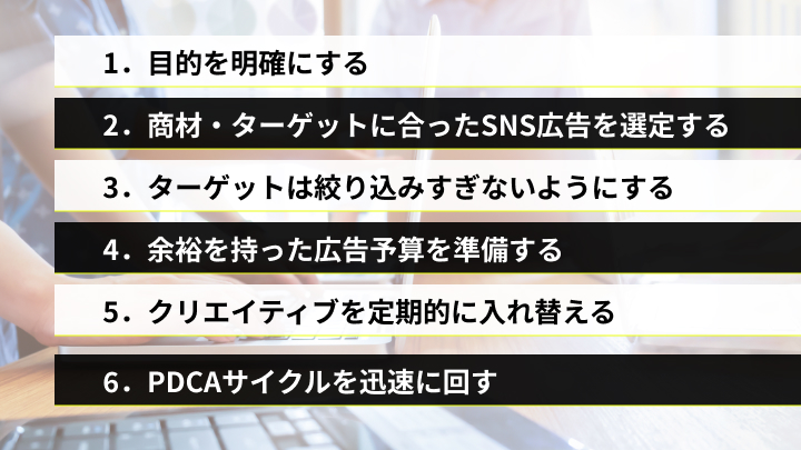 なお、SNS広告の運用を成功させるポイントは、以下の6つです。
