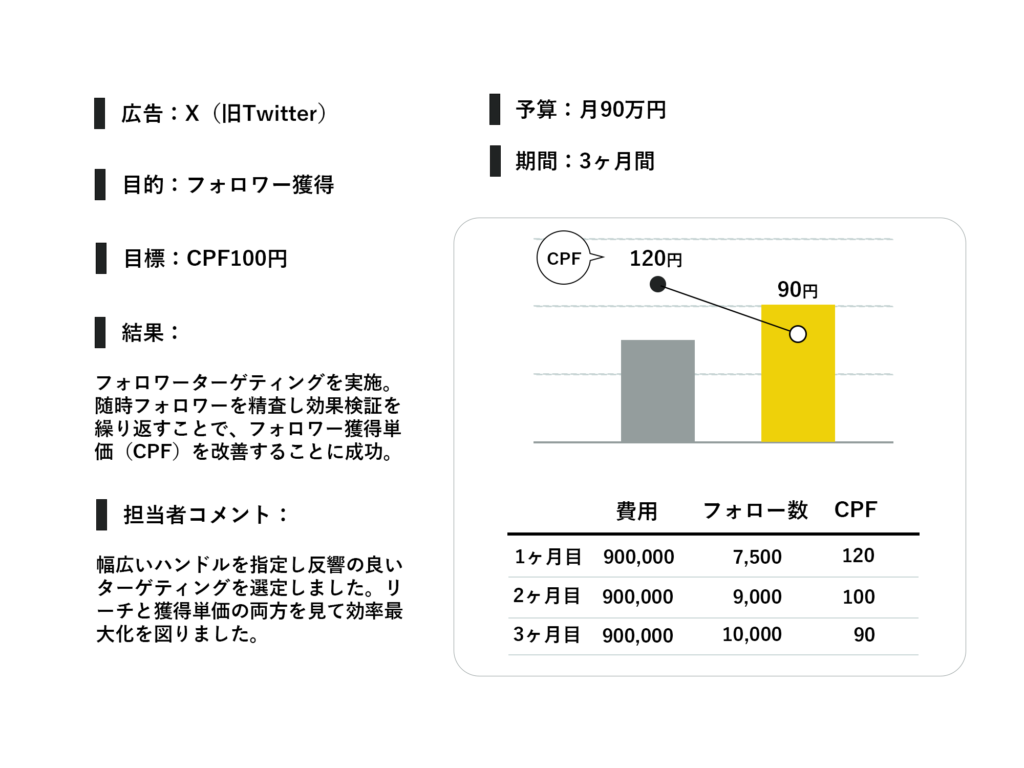 観光支援サービスの広告をX(旧Twitter)広告にて配信しました。Xを選択した理由は、拡散性が高く、フォローまでのハードルが比較的低いからです。フォロワーターゲティング(ハンドルターゲティング)のリストを随時入れ替えることで、CPF(フォロワー単価)の引き下げに成功しました。