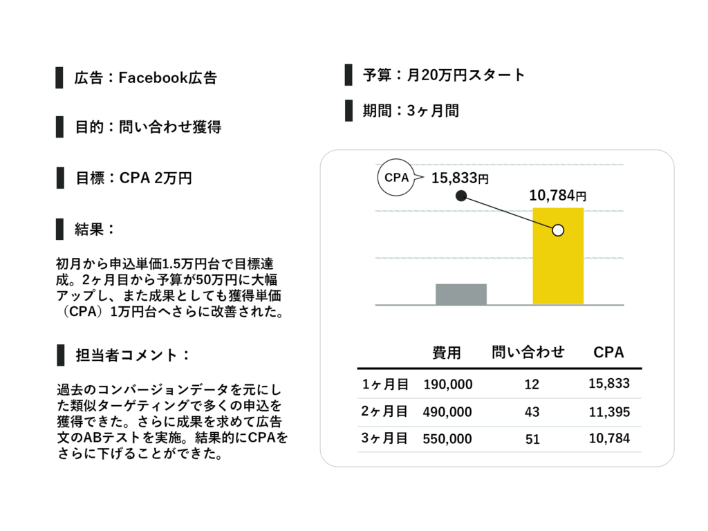 副業ビジネスセミナーの広告をFacebook広告にて配信しました。Facebook広告を選択した理由は、これまでにセミナーに参加した顧客データを活用できたからです。過去の顧客データをもとにした類似ターゲティングを利用することで、初月から目標を達成する成果を出せました。その後は、さらなる効果改善を目指して、広告分やクリエイティブの検証を行い、最終的にはCPA(顧客獲得単価)を1万円台まで下げることに成功しました。