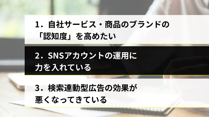 SNS広告は、準顕在層~潜在層にアプローチできるため、ブランド認知度拡大や新しい見込み客の獲得に効果的です。SNS広告の運用がおすすめの企業の特徴は、大きく以下の3つ。