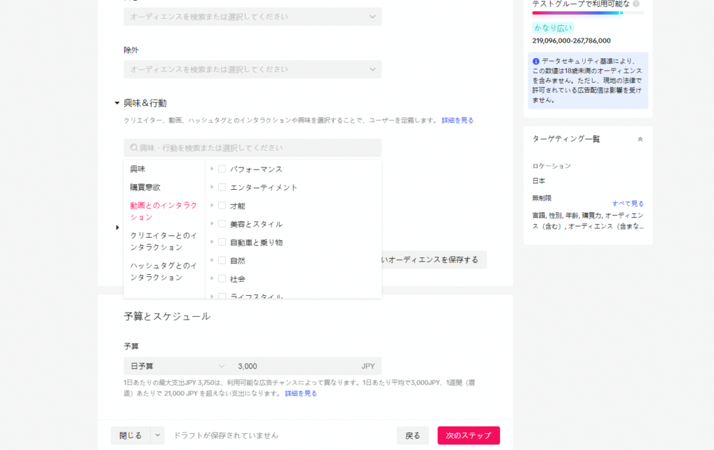 動画インタラクションは、TikTok広告が用意したカテゴリーの中から選択して設定します。自社サービスと関連性の高いカテゴリーを選択することで、高い広告効果が期待できるでしょう。