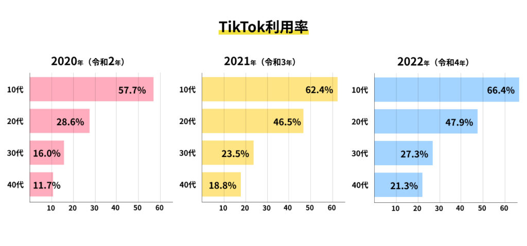 TikTokの利用率は、10代で約60%超(※3)と若者の圧倒的な支持を集めていますが、30代以上の利用者も年々増加中です。総務省のデータによると、30代の利用率は、2020〜2022年の3年間で、16.0%、23.5%、27.3%と着々と数字を伸ばしています。さらに、40代では3年間で11.7%から21.3%と倍増した結果となりました。(※4)
