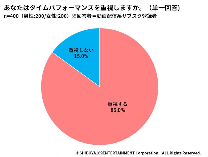 TikTokのメインユーザー層である、Z世代(12歳〜28歳前後)の映像コンテンツの楽しみ方は、タイパを重視しています。SHIBUYA109 lab.の調査(※1)によると、タイムパフォーマンスを重視する人は85.0%もいました。