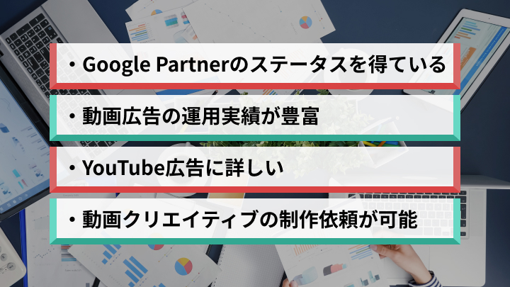 YouTube広告はGoogle広告の中のひとつです。そのため、Google Partnerのステータスを得ている広告代理店は、それだけの実績があり、信頼できる企業と捉えることができます。ただし、Google Partnerのステータスを得ているからといって、YouTube広告の運用実績が豊富とは限りません。依頼する際は、必ず「YouTube広告の運用実績」について確認しましょう。