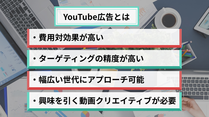 また、YouTube広告は、Google広告の管理画面内で設定をするため、Google広告の持つ「精度の高いターゲティング」を利用できるのも大きな魅力といえます。